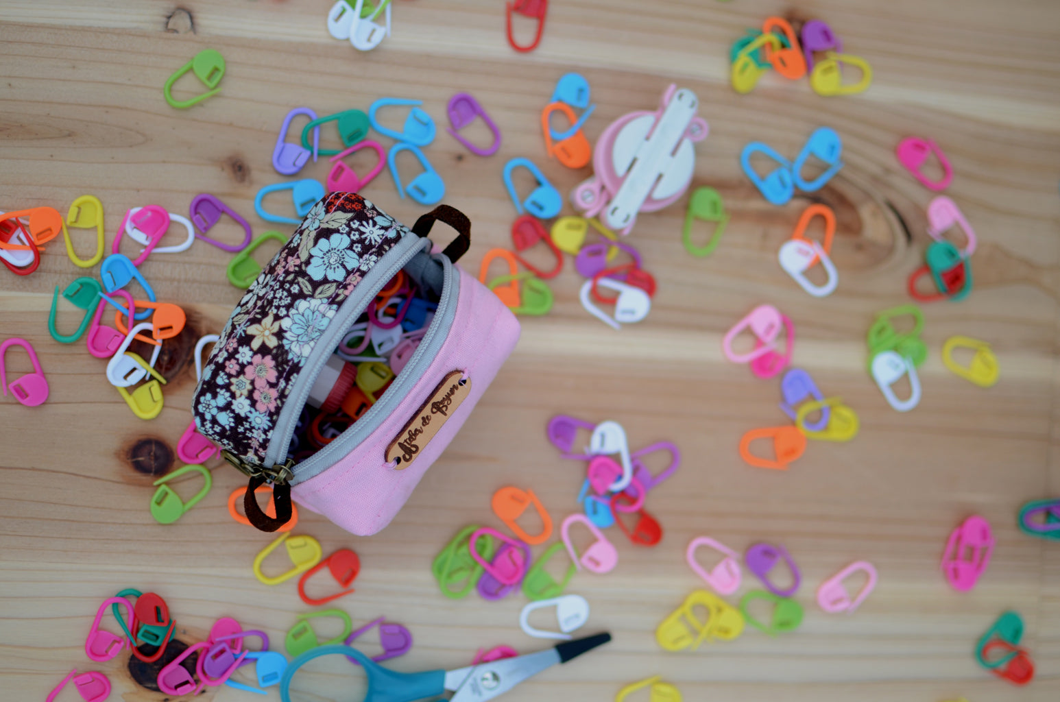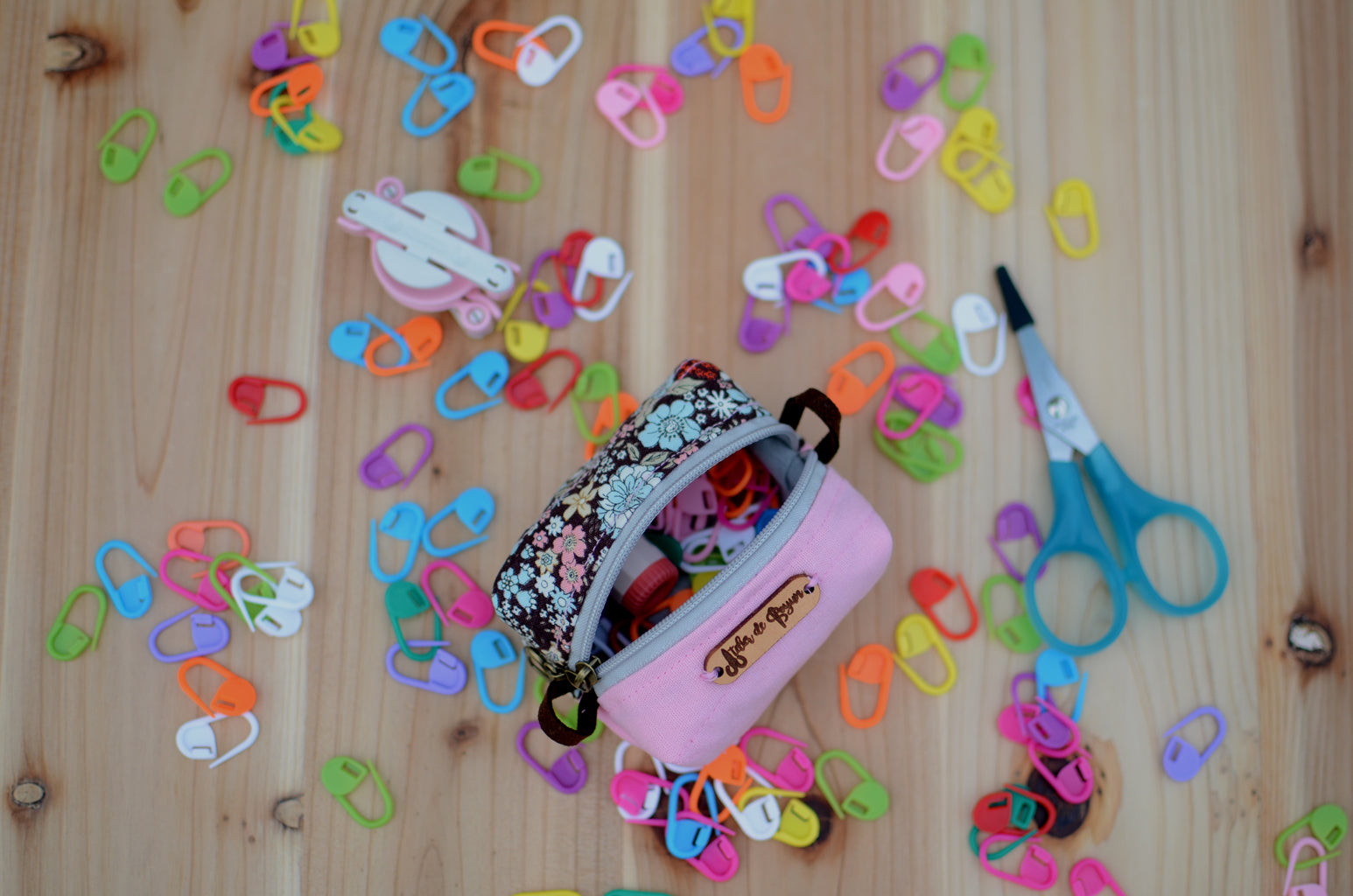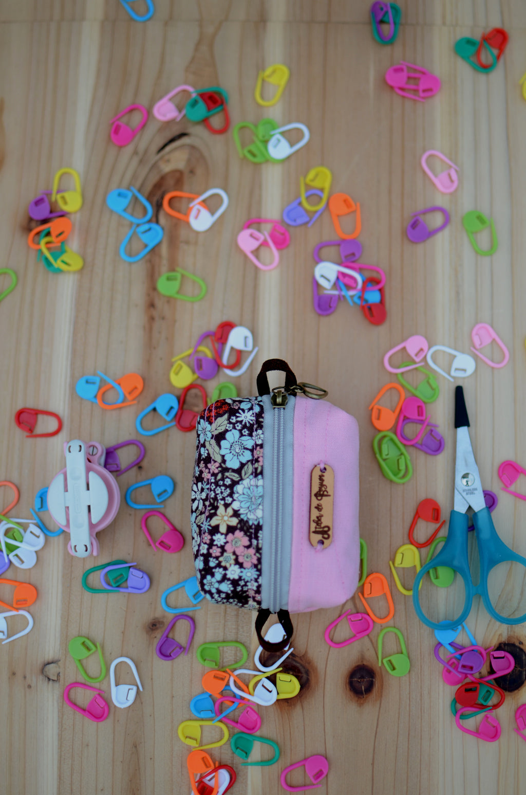 Coin purse/ mini box storage for your knit essentials/ Pink with extra cozy brown floral