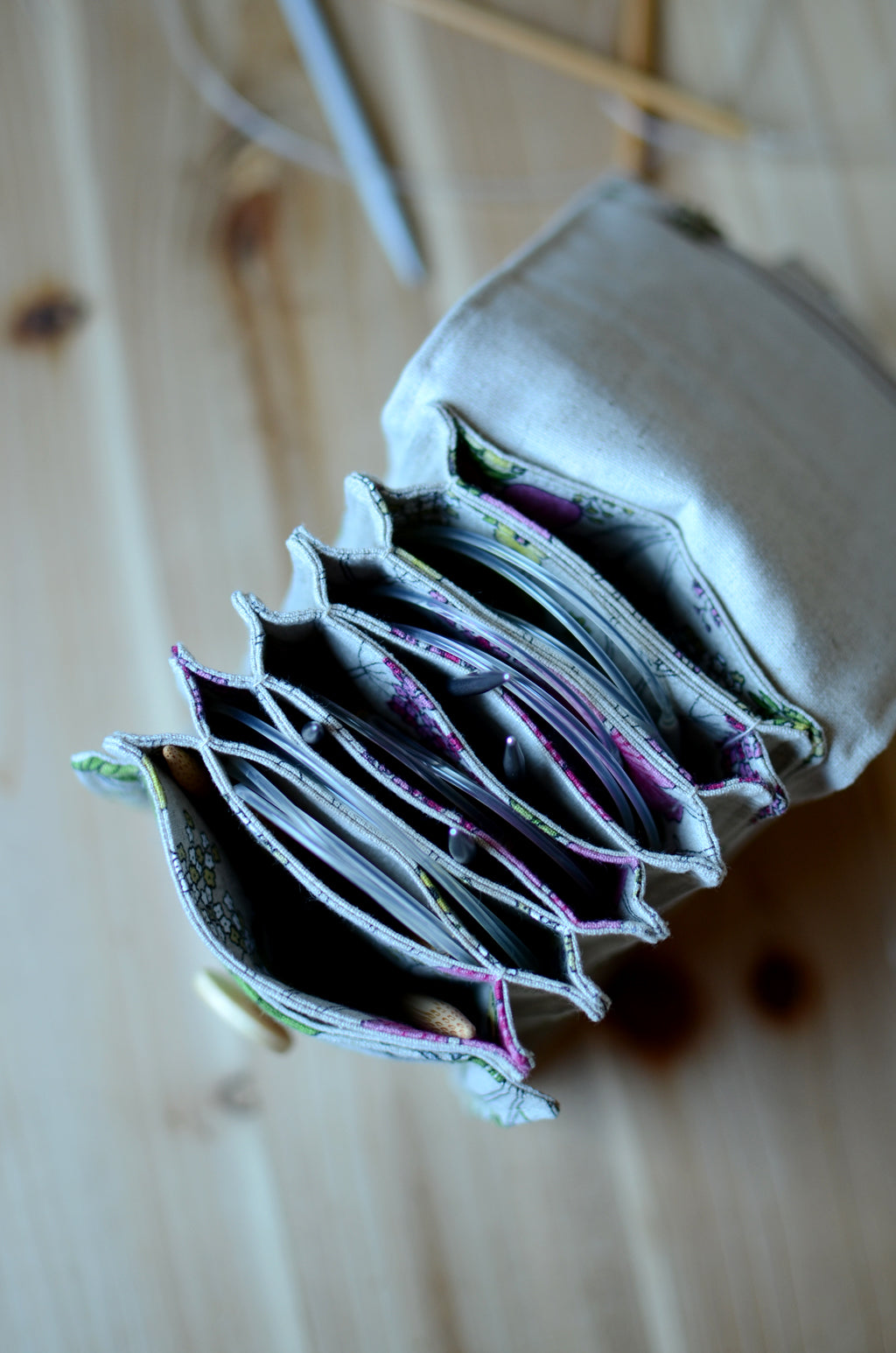 Are you looking for a needle case that has lots of pockets for all knitting needle sizes? What about this? A needle holder that can organize lots of needles yet can be extra-compact. Doesn't this sound awesome? When you open up the case those pockets extend one by one just like onion layers. Easy to hold many circular needles and knitting notions as well as fun to play when you organize them.