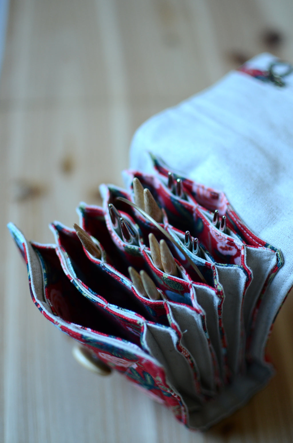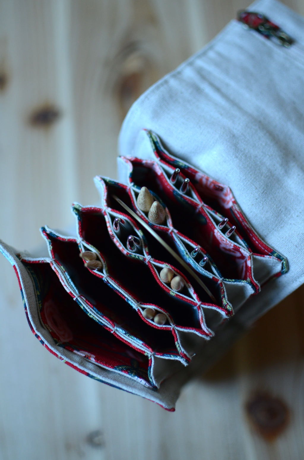 This One-of-A-Kind interchangeable knitting needle case is created with top quality natural linen in vibrant, eye-catching color paired with fun and interesting print inner needle pockets! Texturized one piece by one piece with a heart full of attention and love the interchangeable needle holder would make a precious, unique, and collectible addition to your knitting and crochet dream basket. As compact as your wallet the knitting needle organizer effortlessly houses many different sizes of needle sets, stitch markers, progress keepers, and even small scissors.