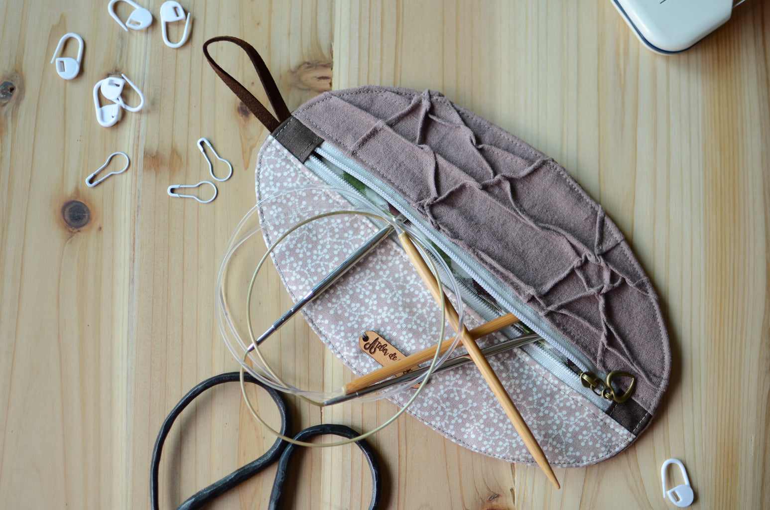 Unique knitting needle organizer for knitting needles, stitch markers, tape measure, and scissors